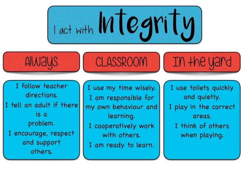 Carisbrook Primary School students, staff and parents believe that integrity is ‘being your word’, doing what you say you’re going to do and doing the right thing even when it’s difficult or when nobody is watching. The ‘right thing’ is what is best for everybody who is concerned. It means following through with your agreements and promises, and if you can’t meet what you say, renegotiate. When you have integrity with someone, there is trust between you. It is essential to have integrity with both yourself and others.